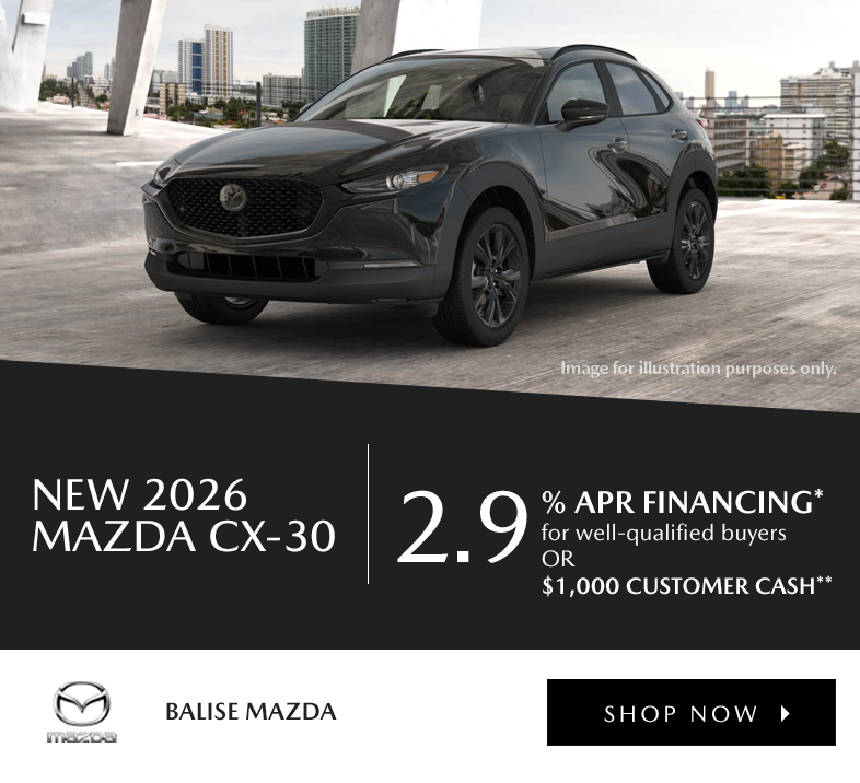 2.9% APR financing OR $1,000 Customer Cash available on New 2026 Mazda CX-30 models. *2.9% annual percentage rate limited term (36 months) financing available through Mazda Financial Services to well-qualified buyers, not all will qualify. Down payment may vary. **$1,000 Customer Cash from Mazda available when you purchase a New 2026 Mazda CX-30 model. May not be combined with low APR. ALL OFFERS: All incentives to dealer, may not be compatible with other offers. Take delivery by 3/2/2026.