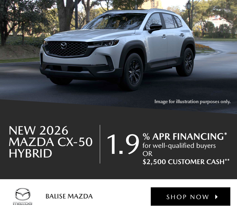 1.9% APR financing OR $2,500 Customer Cash available on New 2026 Mazda CX-50 Hybrid models. *1.9% annual percentage rate limited term (36 months) financing available through Mazda Financial Services to well-qualified buyers, not all will qualify. Down payment may vary. **$2,500 Customer Cash from Mazda available when you purchase a New 2026 Mazda CX-50 Hybrid model. May not be combined with low APR. ALL OFFERS: All incentives to dealer, may not be compatible with other offers. Take delivery by 3/2/2026.