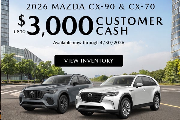 $3,000 Customer Cash available on a new 2026 Mazda CX-70 Inline 6 Turbo (3.3 Turbo Premium, 3.3 Turbo Premium Plus, 3.3 Turbo S Premium, 3.3 Turbo S Premium Plus trims only) or 2026 Mazda CX-90 Inline 6 Turbo (3.3 Turbo Premium Sport, 3.3 Turbo Premium Plus, 3.3 Turbo S Premium Sport, 3.3 Turbo S Premium Plus). Offer available in lieu of Mazda Financial Services special finance or special lease programs. No cash value. Offer only available at dealers in the United States regardless of buyer’s residency. Restrictions may apply; void where prohibited. Offer is only available on participating Mazda Dealer’s current inventory, which is subject to availability. Offer ends 6/1/26 and you must take delivery prior to expiration of offer. See participating Mazda Dealer for complete details.
