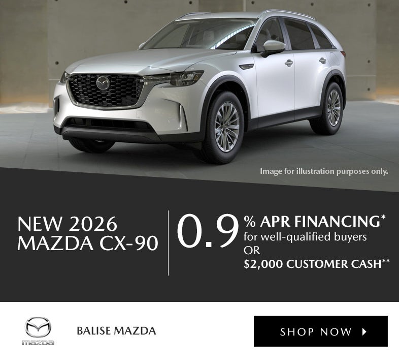 0.9% APR financing OR $2,000 Customer Cash available on New 2026 Mazda CX-90 models. *0.9% annual percentage rate limited term financing available through Mazda Financial Services to well-qualified buyers, not all will qualify. Down payment may vary. **$2,000 Customer Cash from Mazda available when you purchase a New 2026 Mazda CX-90 model. May not be combined with low APR. ALL OFFERS: All incentives to dealer, may not be compatible with other offers. Take delivery by 4/30/2026.
